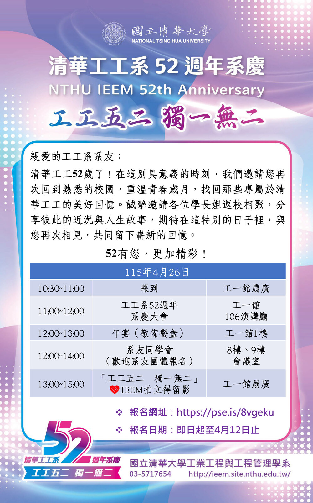 【工工五二 獨一無二】清華大學工工系52週年系慶活動開始報名!
